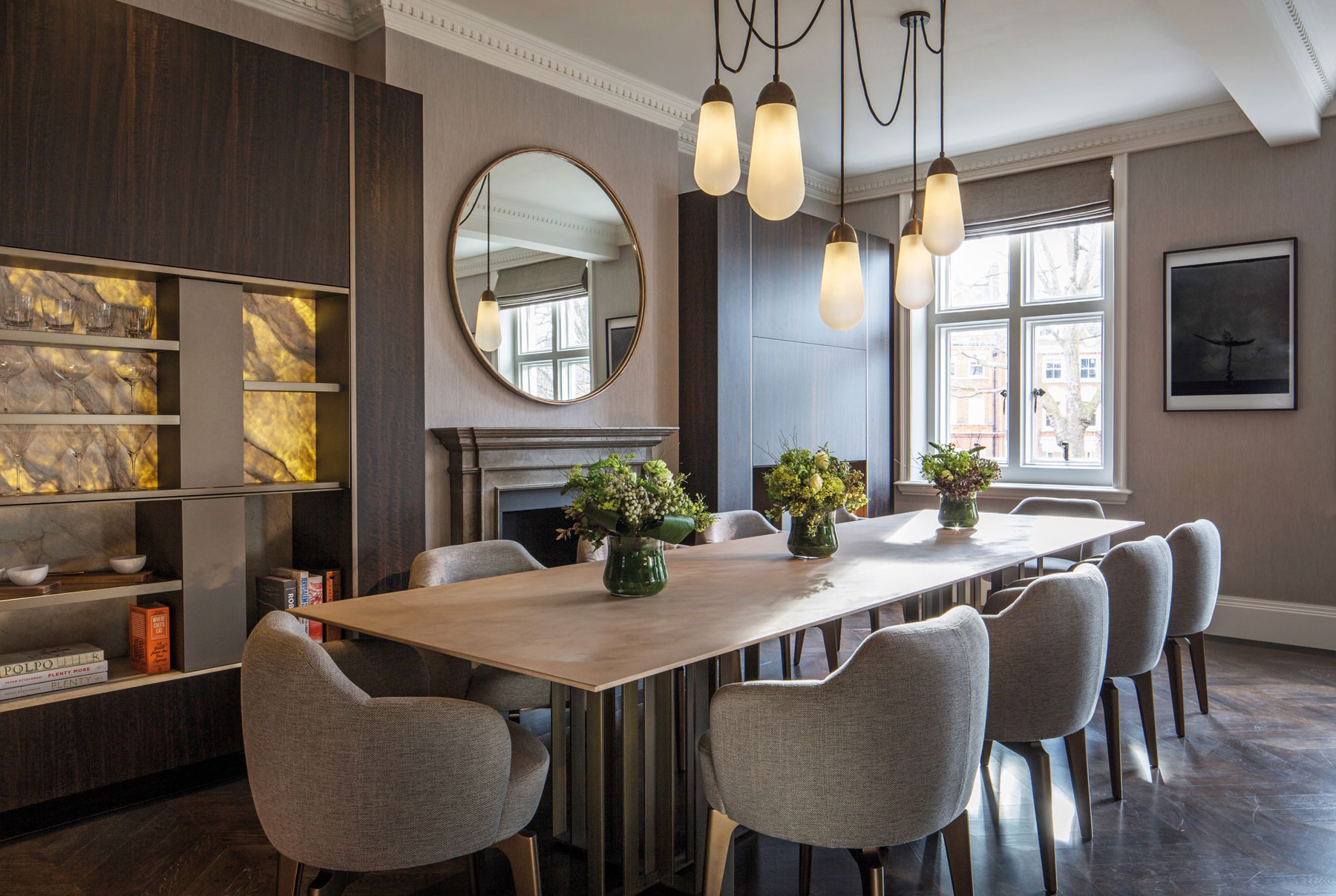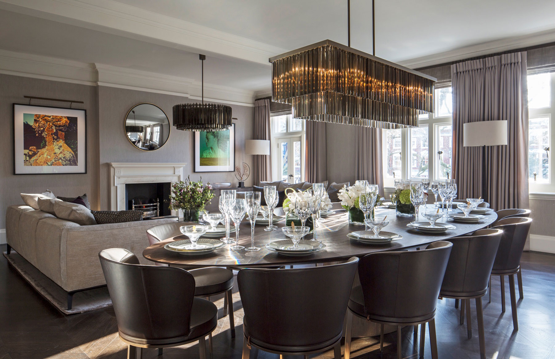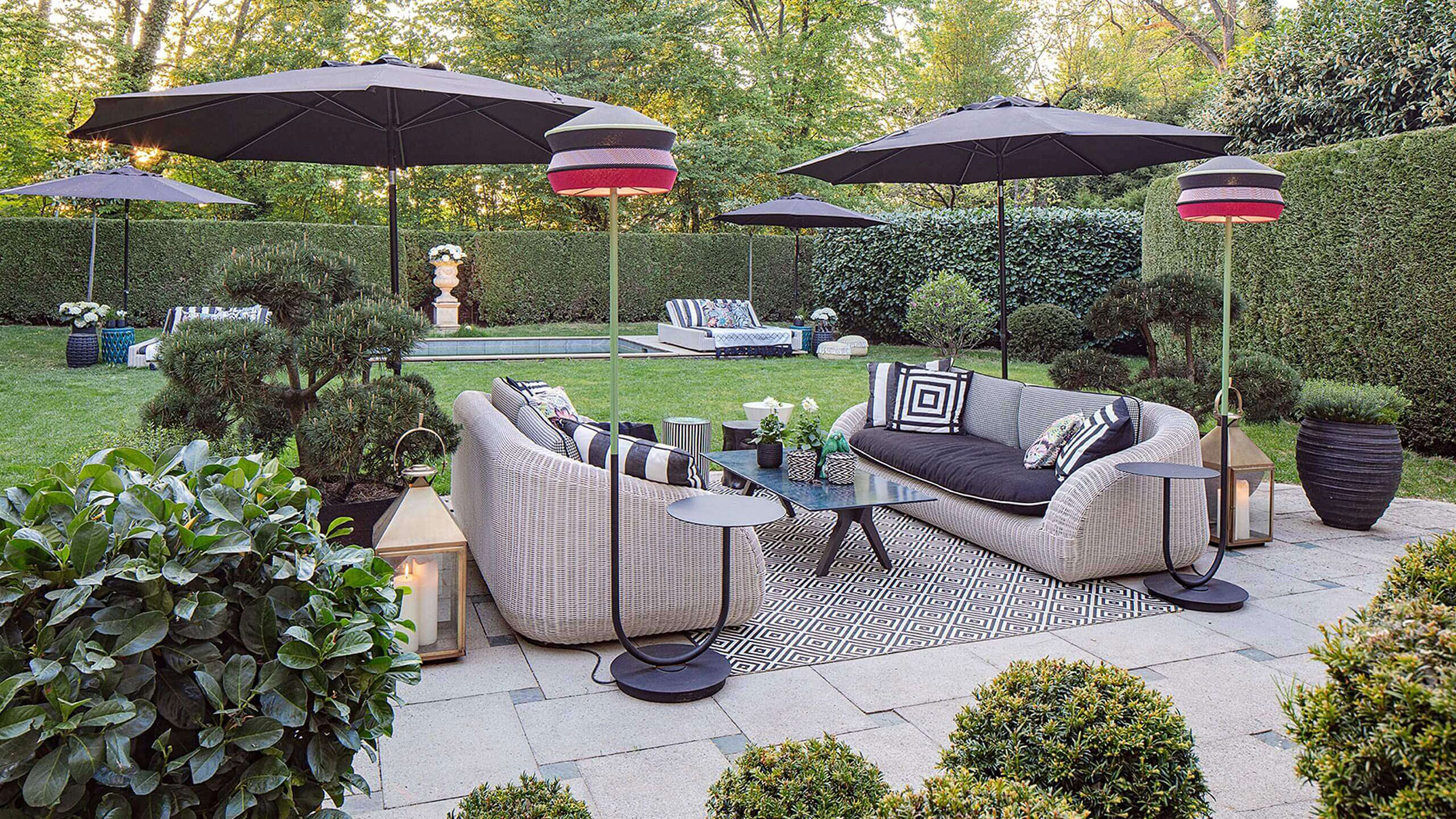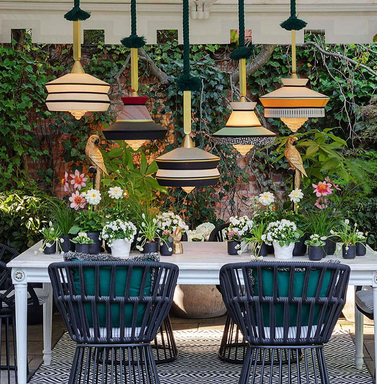 Einladende Inseln wurden mit Hilfe gut ausgestatteter moderner Gartenmöbel und Beleuchtung entworfen, die sich perfekt in den klassischen Stil der Architektur der Villa einfügen und einen gemütlichen, ungezwungenen Aspekt schaffen. Der Essbereich wurde unter einem maßgefertigten Baldachin mit romantischen Hängelampen, die vom Zeltdach baumeln, ins Freie gebracht - der Star der Show ist hier die legendäre Outdoor-Version des Calypso Leuchte von Contardi mit einer Schutzart von IP65 damit ist diese zu jeder Jahreszeit für jeden Außenbereich geeignet.