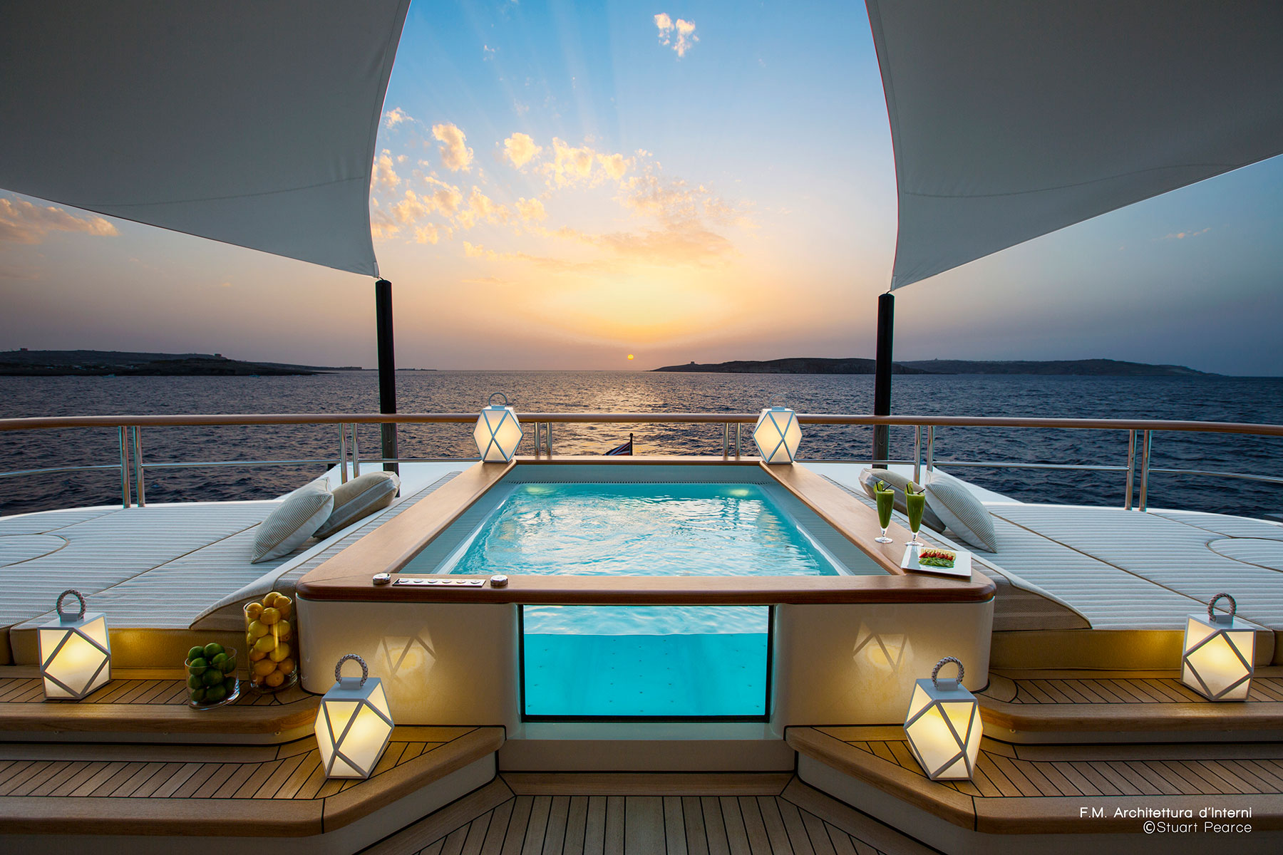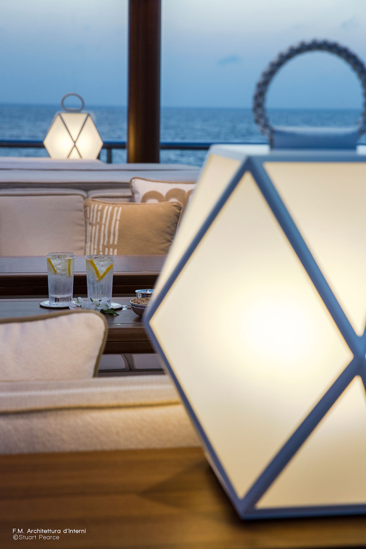 Das schlanke Design der Außenlaternen von Muse Battery verleiht dem neuen modernen quadratischen Spa-Pool mit zwei großen Sonnenpolstern auf beiden Seiten und der Bereitstellung wesentlicher Lichtpunkte in der Bartheke auf der Flybridge neben dem Haupteingang und eine raffinierte Note der Ruhebereich mit Whirlpool.