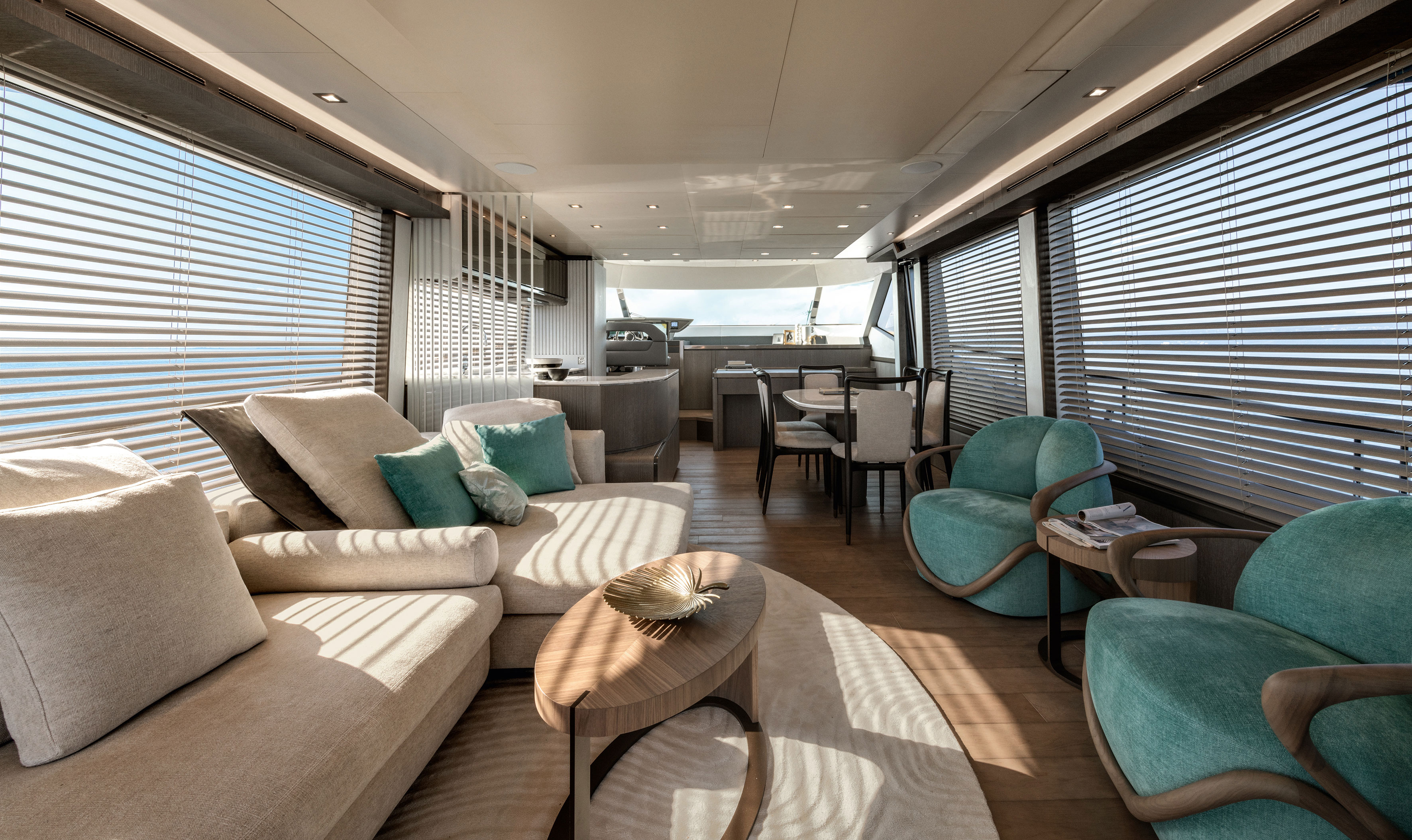 Die legendären Hug-Sessel, Ibla-Stühle und Ling-Couchtische bereichern das überraschend großzügige Interieur der MCY76, mit einem besonders natürlichen Licht und einem beispiellosen Maß individueller Gestaltung. „Mit einer Länge von 23,06 Metern ist MCY 76 der natürliche Nachfolger der ersten Yacht, die wir vor mehr als zehn Jahren gemeinsam mit Monte Carlo Yachts entworfen haben“, sagen die Architekten Carlo Nuvolari und Dan Lenard. „Seitdem haben wir an zahlreichen Projekten gearbeitet: Jedes von ihnen ist erkennbar eine MCY und bewahrt zugleich einen einzigartigen Charme und eine eigene Persönlichkeit“. Auf das Modell MCY 76 zurück zukommen war in gewisser Weise wie eine Rückkehr zu den Ursprüngen, dass wir im Nachhinein attraktiver fanden als je zuvor.